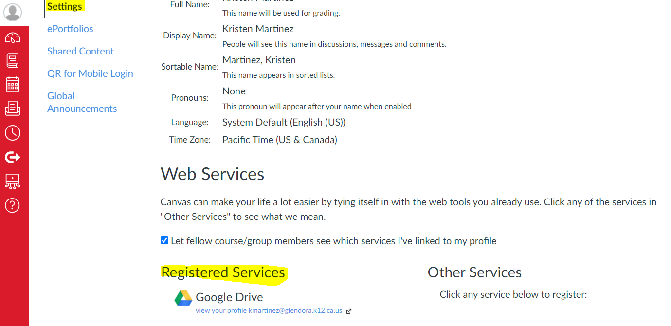2. While in Canvas, click Settings. Scroll down to Web Services. If Google Drive is not under Registered Services the students need to click on the Google Drive icon under Other Services and follow the prompts to register their Drive.