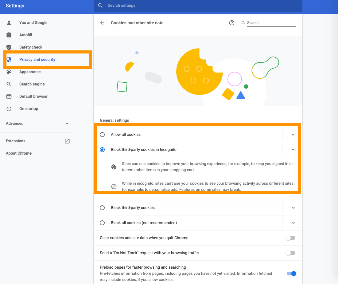 You need to pick Allow all cookies or Block third party cookies in Incognito.